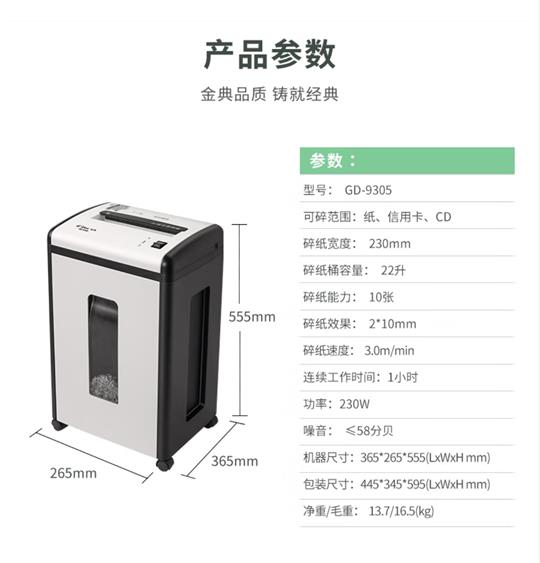 金典 GOLDEN GD-9305碎紙機,10張,60分鐘;